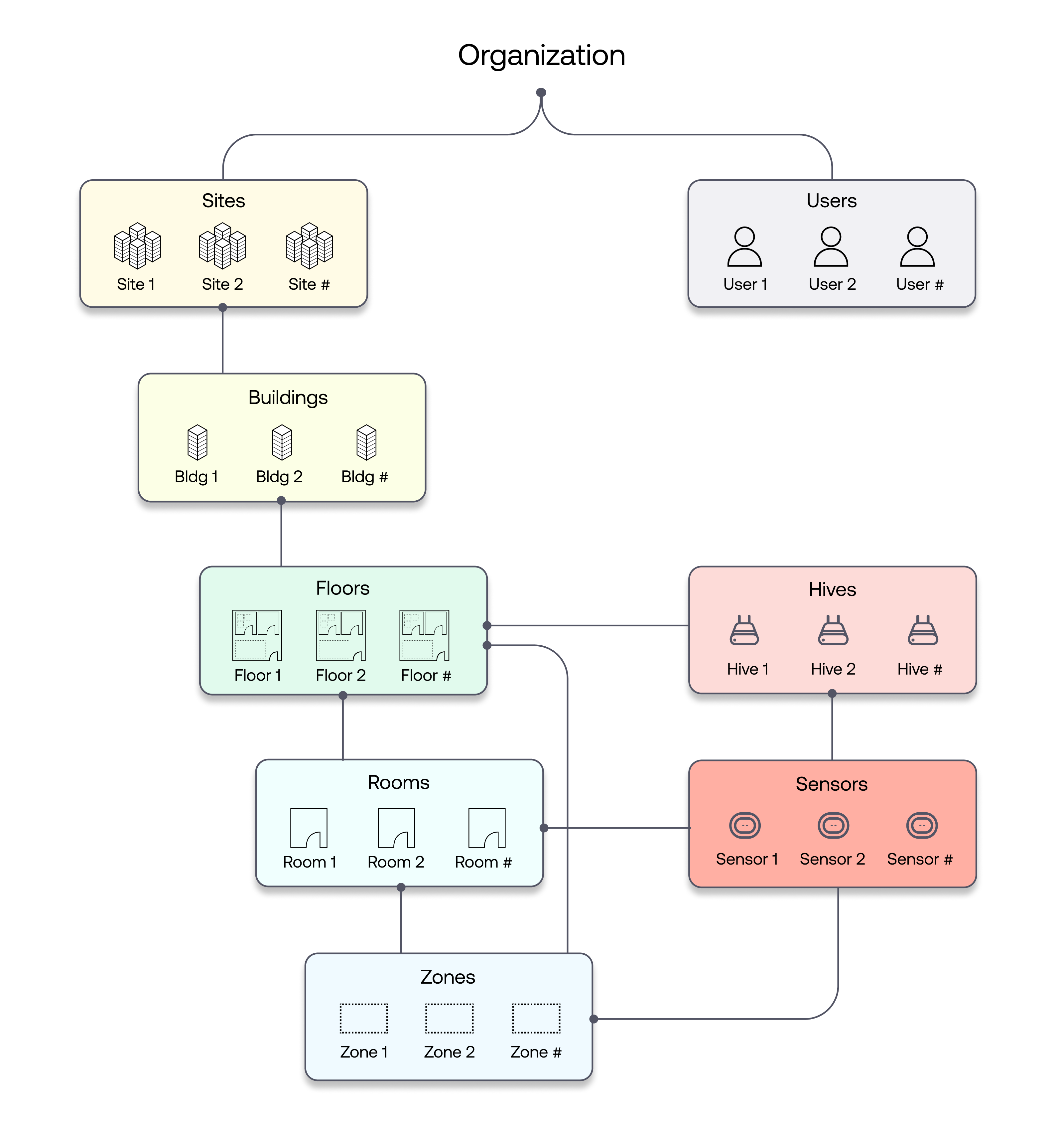 At the core of the Butlr data model is a spatial hierarchical framework that mirrors the management of physical assets —starting with individual sensors in specific zones or rooms and scaling up to encompass entire floors, buildings, and even larger campuses or regional portfolios. This model allows for granular data collection and analysis at every level, from detailed room-level occupancy to aggregated insights across buildings or campuses.