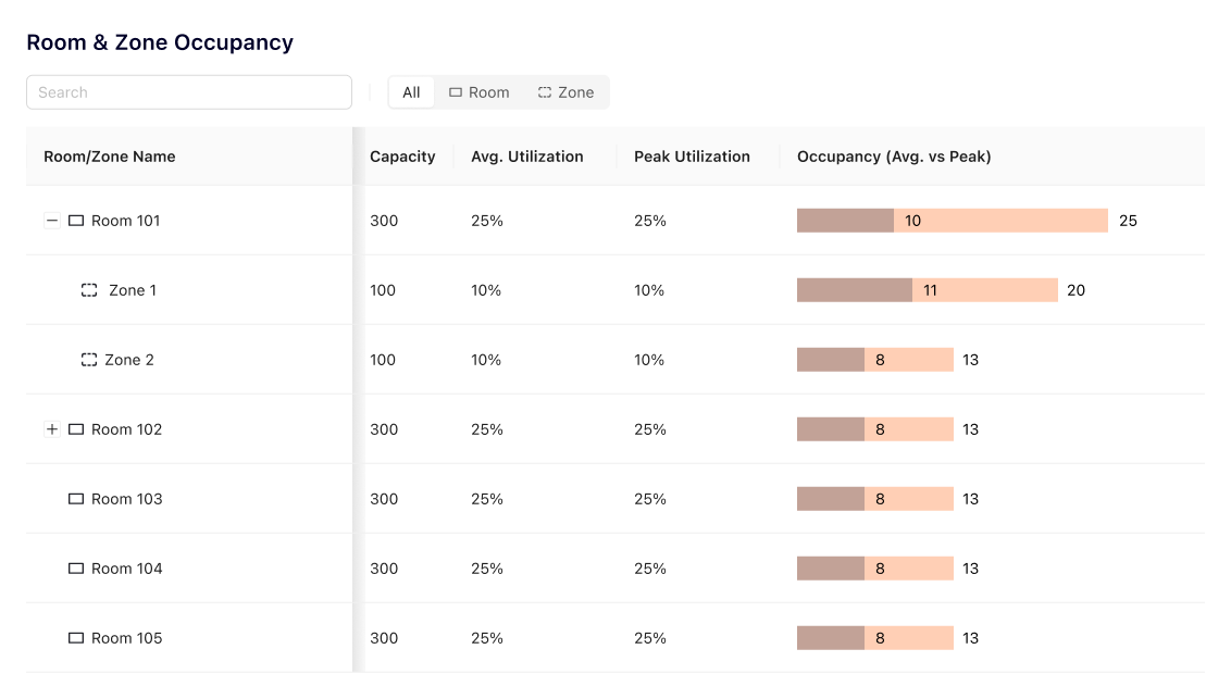 Below are sample queries for retrieving room-level occupancy data to analyze **peak**, and **average** within a selected time range.