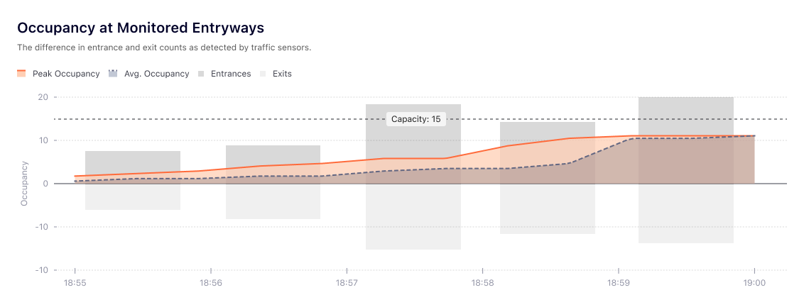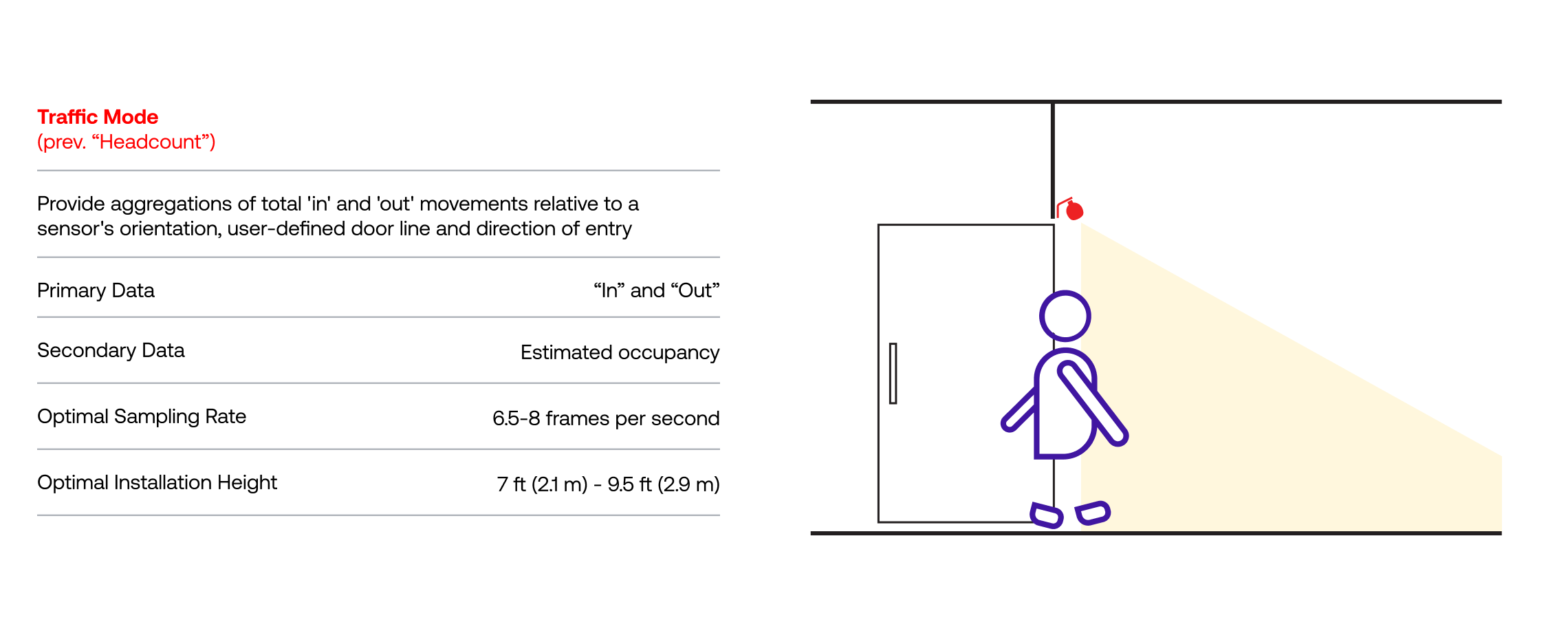 Traffic Mode provides aggregated totals of ‘in’ and ‘out’ movements based on a sensor’s orientation, a user-defined door line, and the direction of entry. For optimal performance, sensors should be mounted above entrances using either a Wall Mount or Ceiling Mount. Occupancy is calculated based on the flow of people in and out.